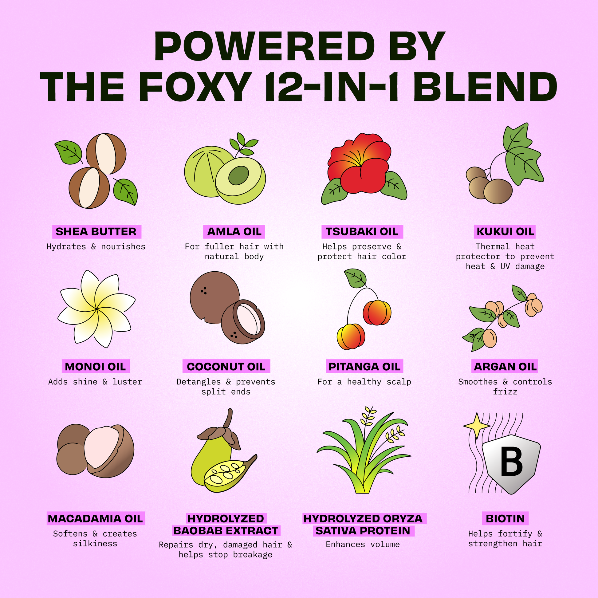 Powered by the Foxy 12-in-1 Blend to gently cleanse and nourish based on hair type.