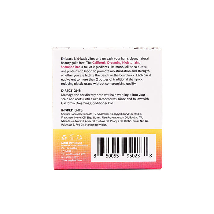Unleash your hair’s lush and nourished strands of your dreams with our eco-friendly, travel-perfect California Dreaming Moisturizing Shampoo Bar! Packed with a hydrating blend of Monoi Oil, Shea Butter, Rice Protein, and Biotin, this plastic-free shampoo bar effortlessly boosts your hair’s moisture and builds strength. Bonus points that every wash is infused with our signature Foxy scent – it’s like a mini vacay to sun-soaked shores and breezy boardwalks.