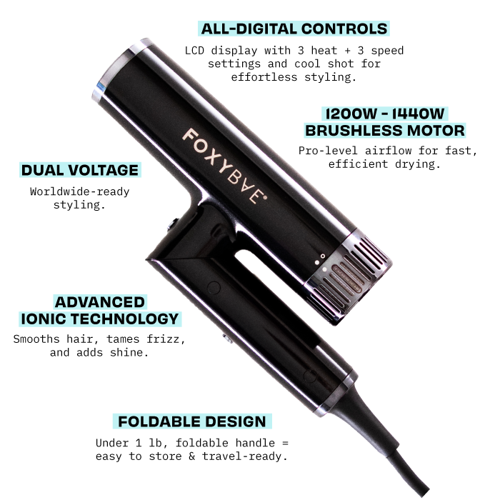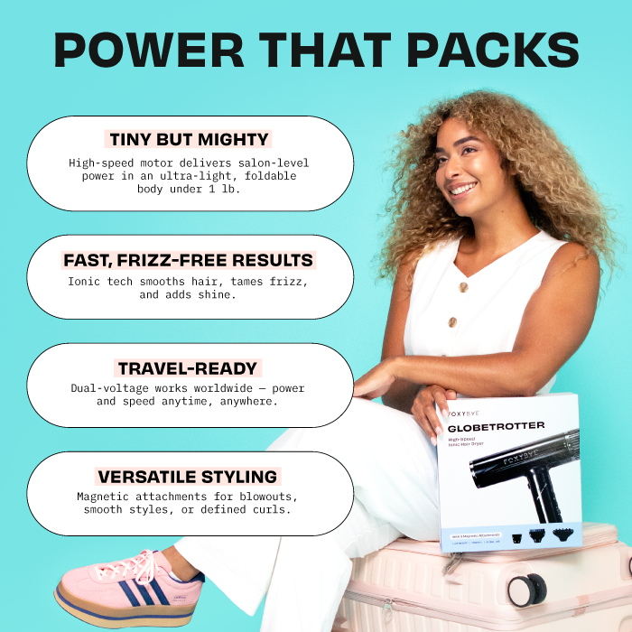 Meet the Globetrotter — your travel-sized, salon-speed dryer that doesn’t make you choose between power and portability. Under 1lb, foldable, and dual voltage (meaning it can be used anywhere in the world without blowing a fuse), it’s built for jet-set lifestyles, cramped bathrooms, and styling anywhere your day (or boarding pass) takes you. The 1200W brushless motor with advanced ionic tech dries hair fast, smooths frizz, and adds shine, with all-digital controls at your fingertips. Snap on one of three magnetic attachments — concentrator, straightening comb, or diffuser — and go from sleek blowouts to frizz-free curls with ease. Tiny but mighty, Globetrotter delivers pro power and speed wherever you style — at home or across the globe.