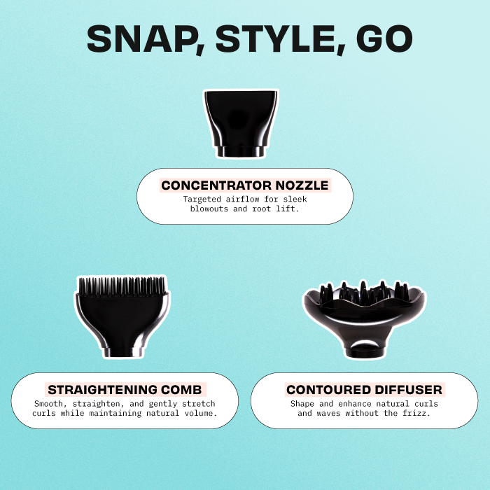Snap on the comb to smooth and straighten as you dry. Glide from roots to ends to tame frizz, stretch curls for blowout prep, or simply dry straighter styles while keeping natural volume.