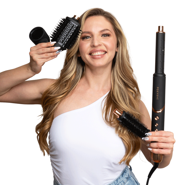 Start with damp hair, section it off, and place the brush under a section of hair close to the roots. Roll the brush from roots to ends, focusing on upward strokes for root lift and volume, and twisting at the ends for a flare. For loose waves, wrap hair around the hot brush barrel and glide the tool down smoothly while twisting. Finish off each section with the Cool Shot to lock in your style. Pro Tip: Use on dry hair to smooth, volumize, and refresh day-two hair along with your favorite Foxy Dry Shampoo!